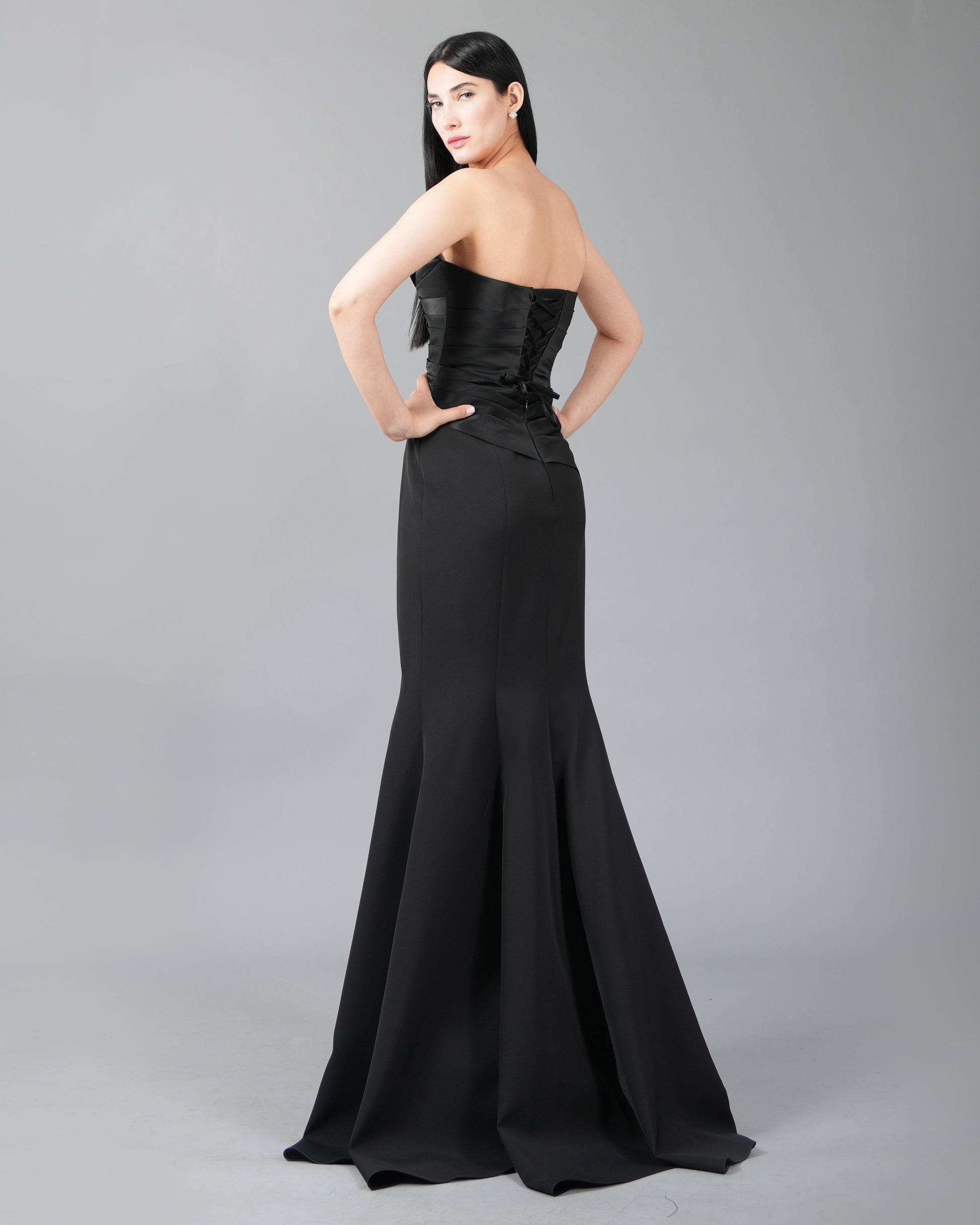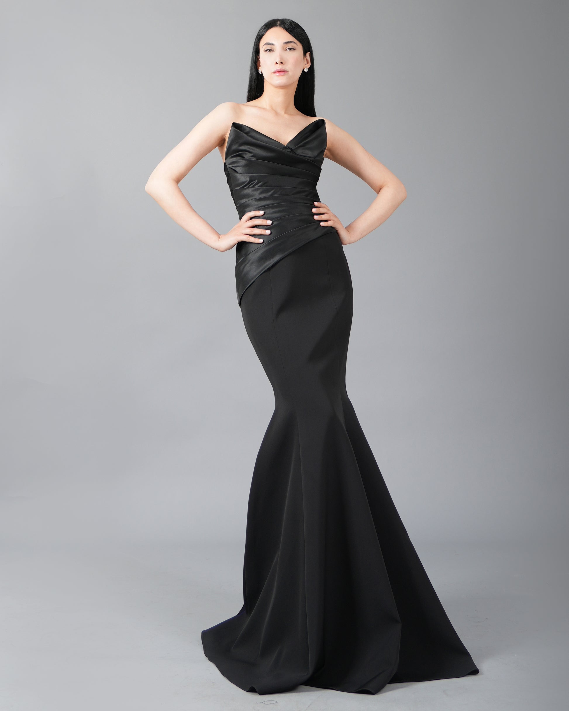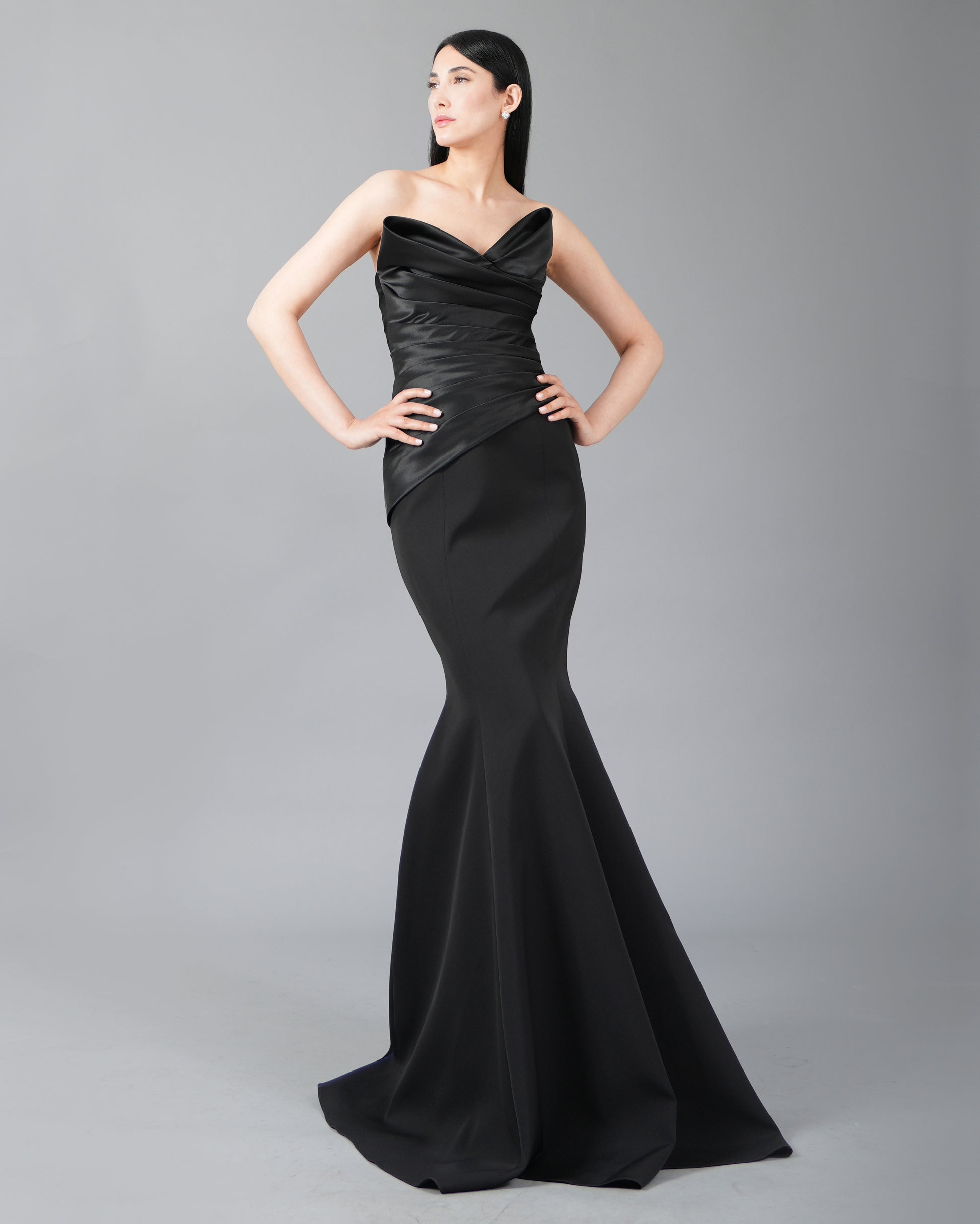 Strike a flawless balance between timeless grace and modern allure in this sculptural strapless gown. Crafted in a luxurious black fabric, the dress features a structured, asymmetrically draped satin bodice that flatters and contours the silhouette. The neckline elegantly folds into a soft sweetheart shape, enhancing the décolletage with subtle sophistication.