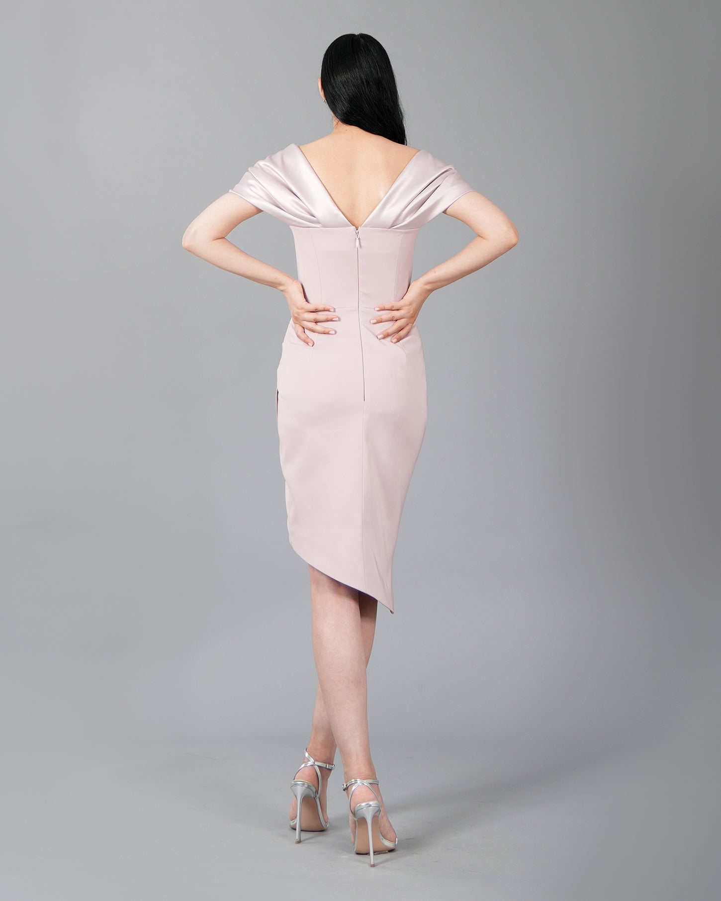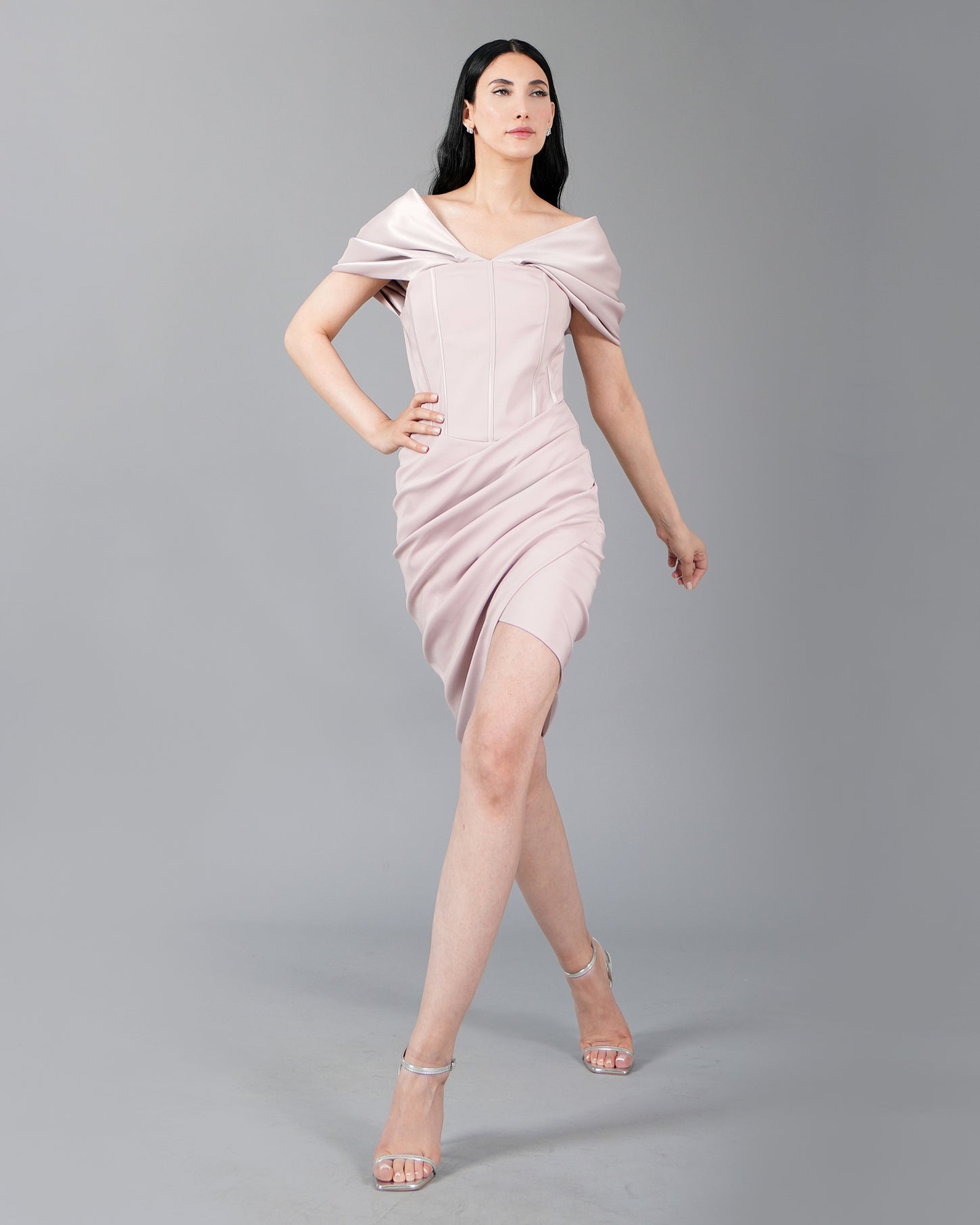 Elegance meets modern grace in this sculpted off-shoulder cocktail dress. Draped in a softly structured silhouette, it highlights the collarbones with an architectural foldover neckline, gently embracing the shoulders for a refined, romantic feel. The corset-inspired bodice subtly contours the figure, while the artfully gathered skirt falls into a sleek asymmetrical hem that adds movement and allure.